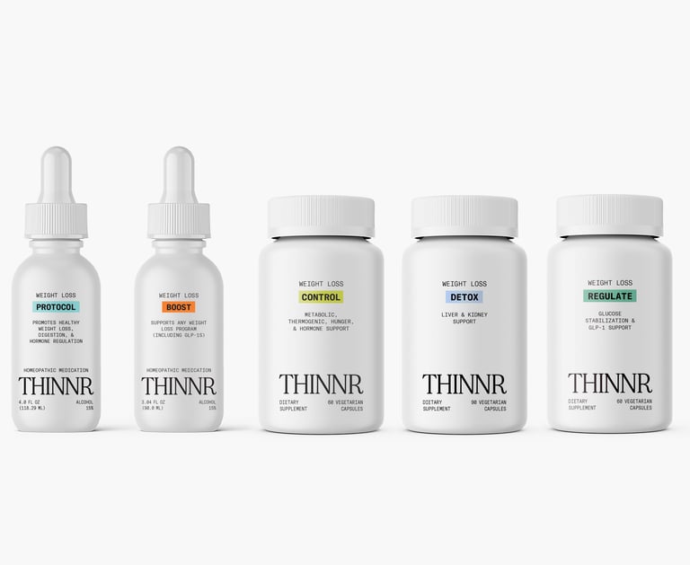 The THINNR homeopathic medication is an all-natural, FDA-registered OTC medicine that supports healthy weight loss, balanced metabolism, lower stress, reduced hunger and cravings, detoxification, and improved elimination.